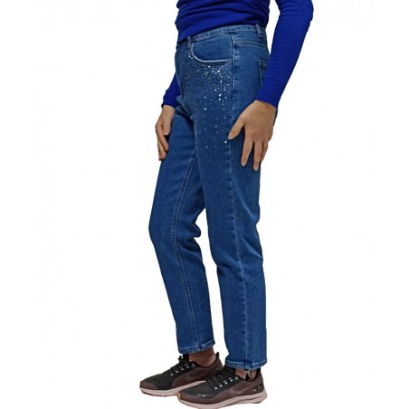 DENIM Straight  Φαρδύ Γυναικείο Τζιν Παντελόνι  Στρας Σκούρο Μπλέ