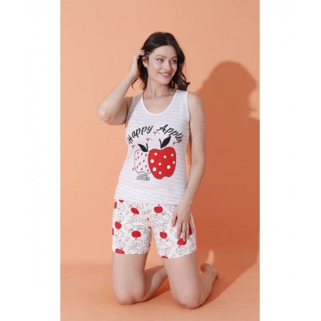 Ανανεώστε τη συλλογή σας με αυτή τη γυναικεία καλοκαιρινή πυτζάμα που συνδυάζει παιχνιδιάρικο σχέδιο και απόλυτη άνεση. Το σετ περιλαμβάνει αμάνικο top με χρωματιστά τυπωμένα μήλα και τη φράση "Happy Apple", καθώς και σορτσάκι με χαρούμενο print μήλων σε κόκκινες και λευκές αποχρώσεις.