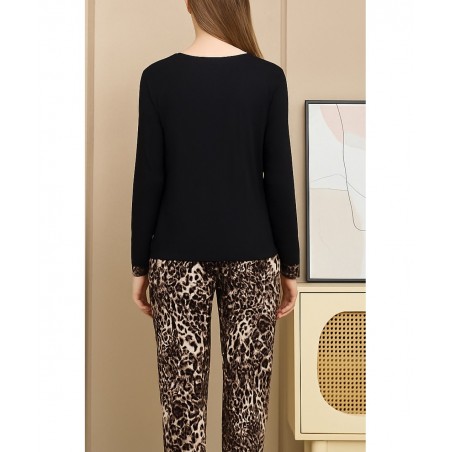 Ανακάλυψε την απόλυτη άνεση και στυλ με τη γυναικεία πυτζάμα animal print. Το σετ περιλαμβάνει μαύρη μπλούζα μακρυμάνικη με διακριτική λεπτομέρεια τσέπης σε leopard σχέδιο και παντελόνι πυτζάμα με leopard animal print για μοντέρνα και κομψή εμφάνιση. Κατασκευασμένη από απαλό και ποιοτικό ύφασμα, προσφέρει άνεση, ελευθερία κινήσεων και ιδανική εφαρμογή. Ιδανική για χαλάρωση στο σπίτι, αλλά και για κομψή εμφάνιση στις πιο cozy στιγμές σου.