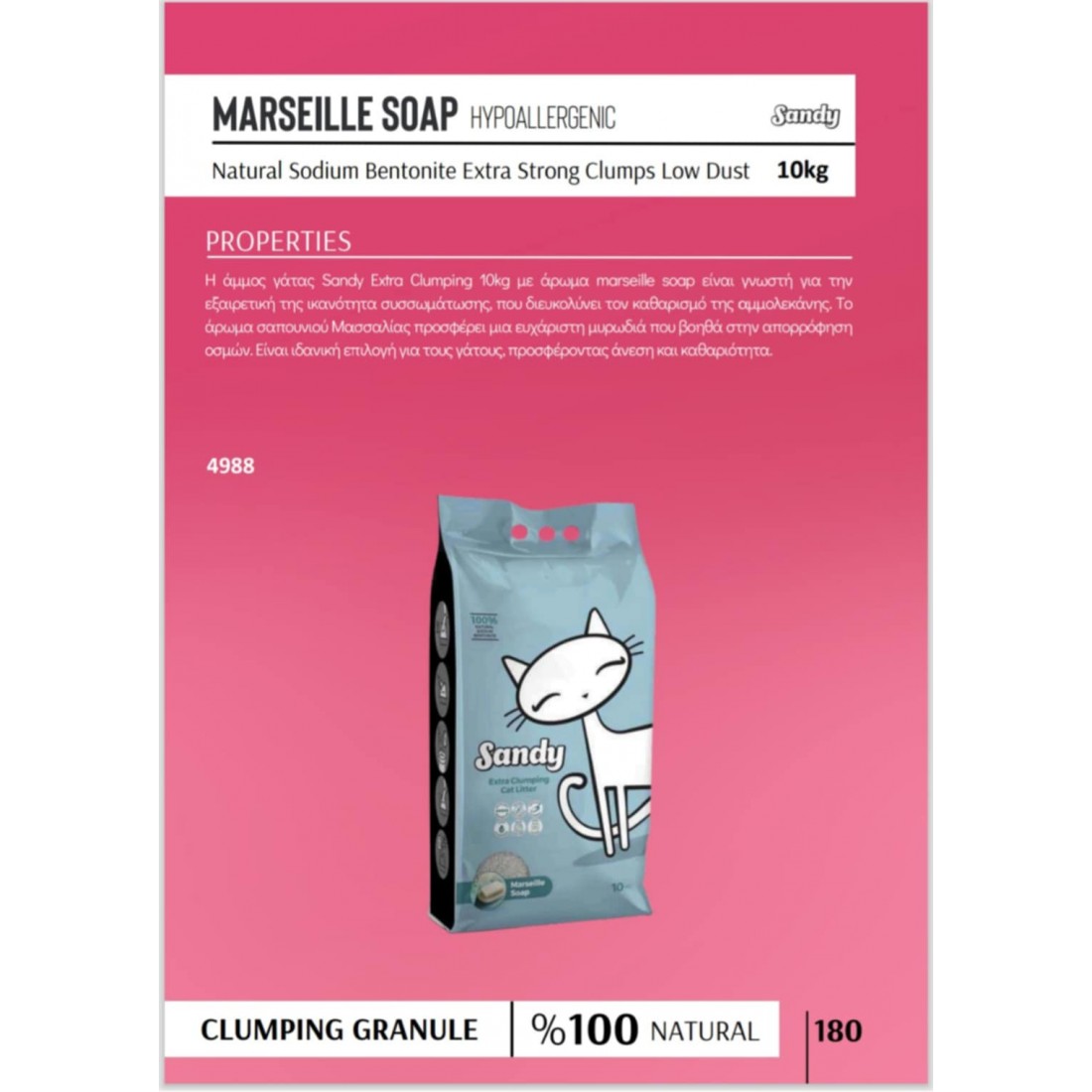 Η άμμος γάτας Sandy Extra Clumping 10kg με άρωμα marseille soap είναι γνωστή για την εξαιρετική της ικανότητα συσσωμάτωσης, που διευκολύνει τον καθαρισμό της αμμολεκάνης. Το άρωμα σαπουνιού Μασσαλίας προσφέρει μια ευχάριστη μυρωδιά που βοηθά στην απορρόφηση οσμών. Είναι ιδανική επιλογή για τους γάτους, προσφέροντας άνεση και καθαριότητα.