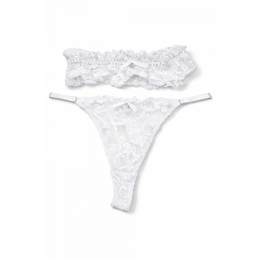 Οι διακριτικοί σατέν φιόγκοι με λεπτομέρεια στρας προσθέτουν μια πολυτελή πινελιά, ενώ τα ρυθμιζόμενα λάστιχα εξασφαλίζουν τέλεια εφαρμογή στο σώμα. Ιδανική επιλογή για ιδιαίτερες στιγμές, νυφική lingerie ή για όσες αγαπούν το κομψό και διαχρονικό στυλ.